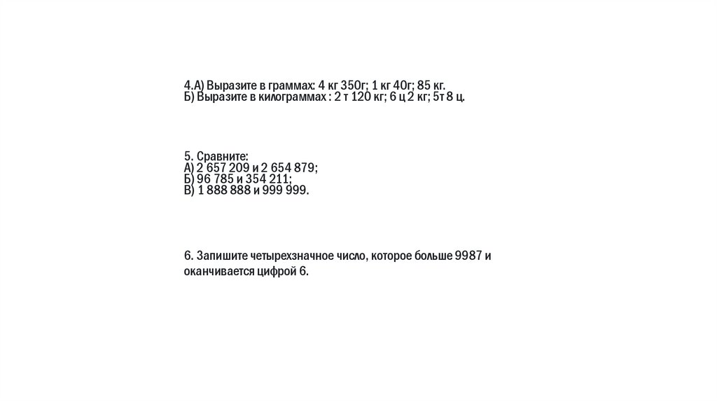 4.А) Выразите в граммах: 4 кг 350г; 1 кг 40г; 85 кг.Б) Выразите в килограммах : 2 т 120 кг; 6 ц 2 кг; 5т 8 ц.