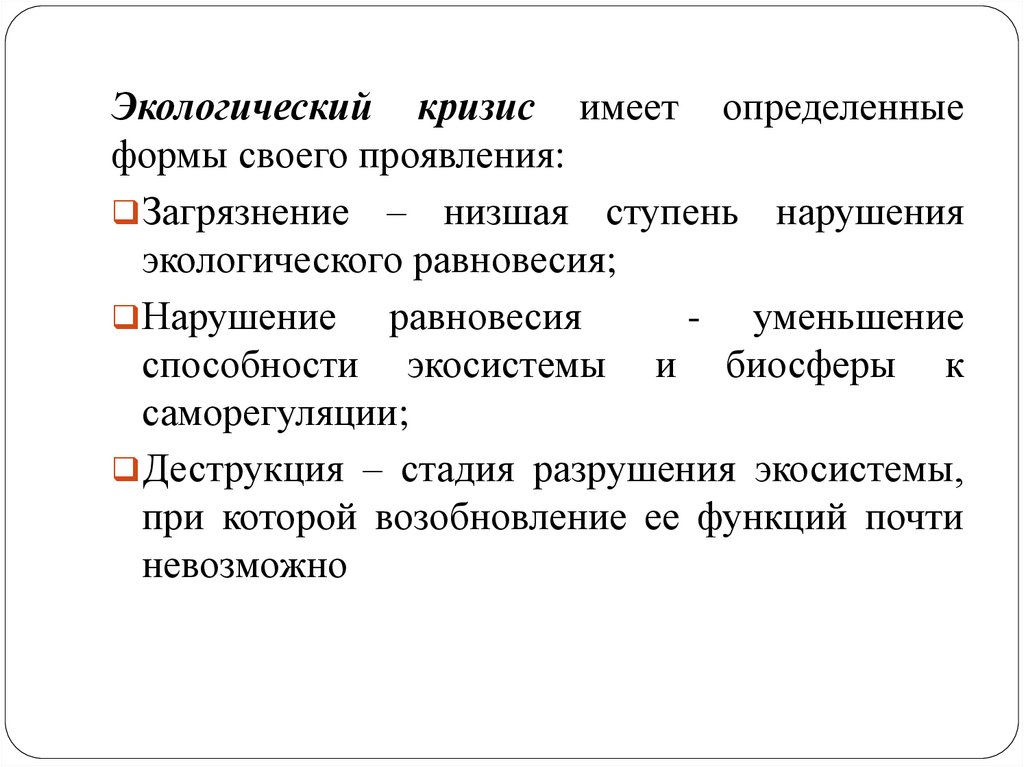 Экологический кризис — это напряженноесостояние взаимоотношений между человечеством и