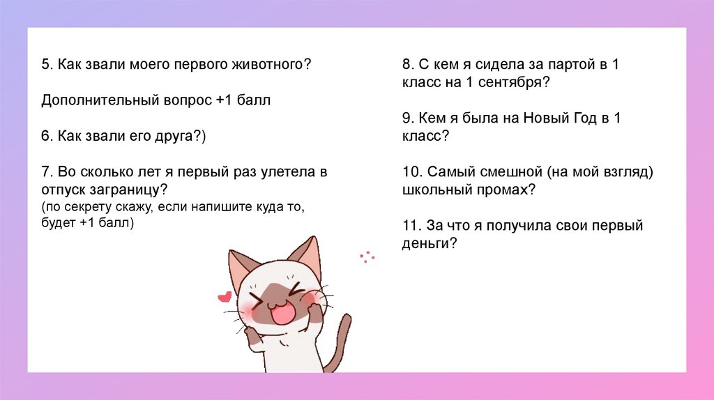 5. Как звали моего первого животного?8. С кем я сидела за партой в 1