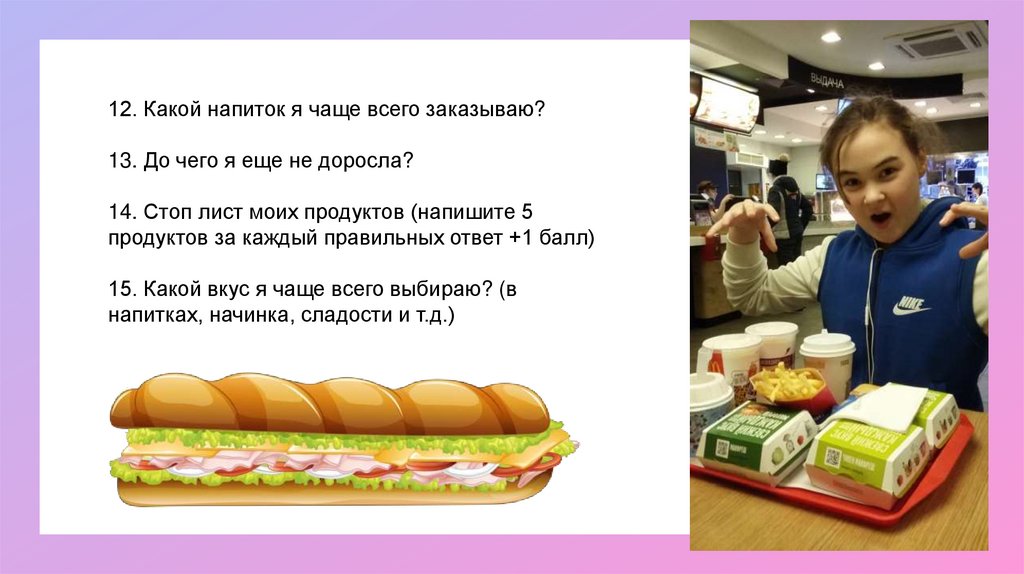 12. Какой напиток я чаще всего заказываю?13. До чего я еще не доросла?