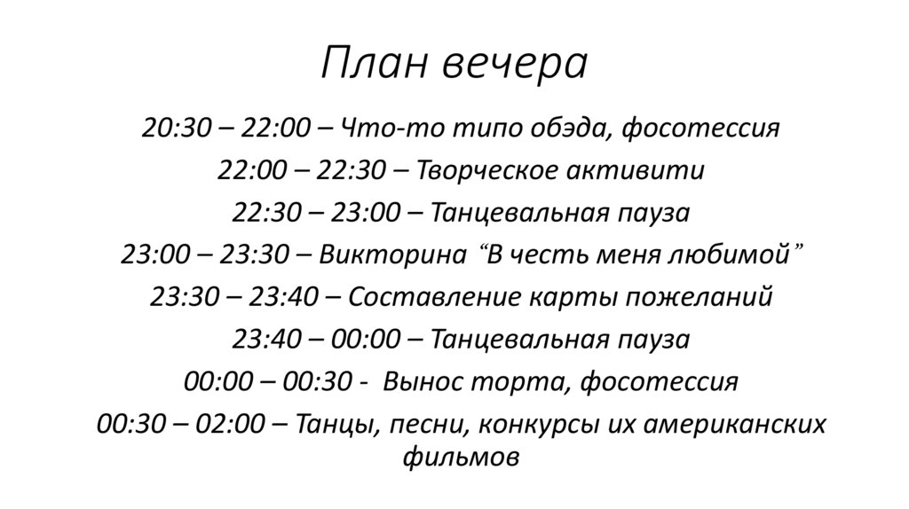 20:30 – 22:00 – Что-то типо обэда, фосотессия22:00 – 22:30 – Творческое активити