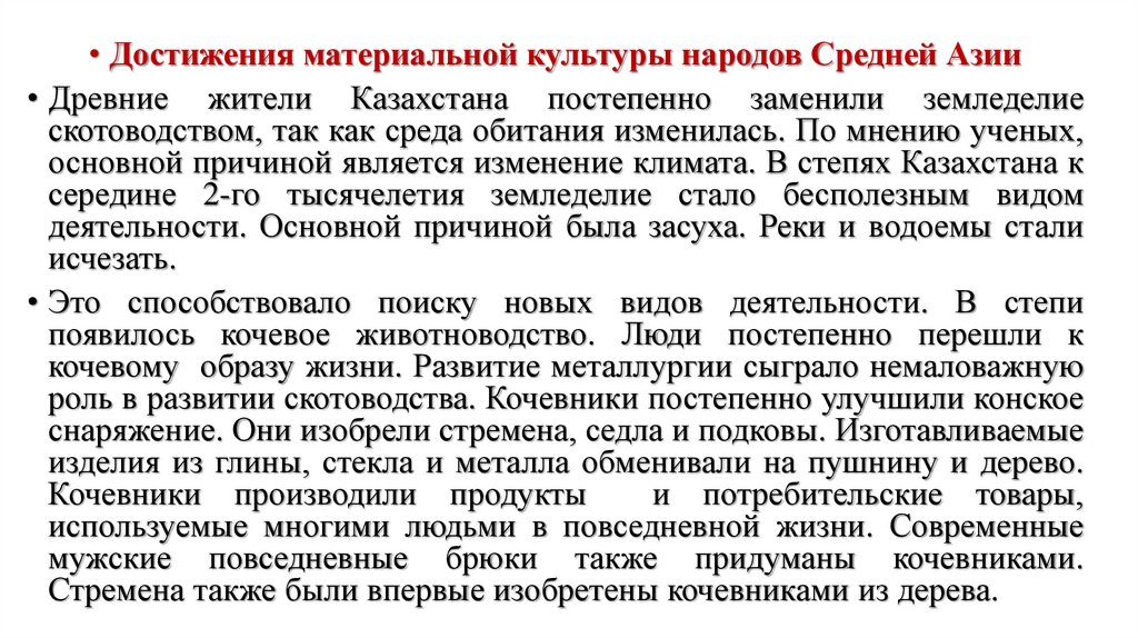 • Достижения материальной культуры народов Средней Азии• Древние жители Казахстана постепенно заменили земледелие