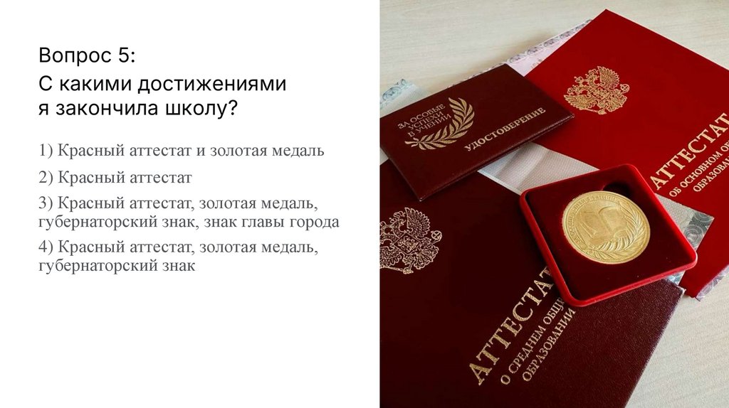 4) Красный аттестат, золотая медаль,