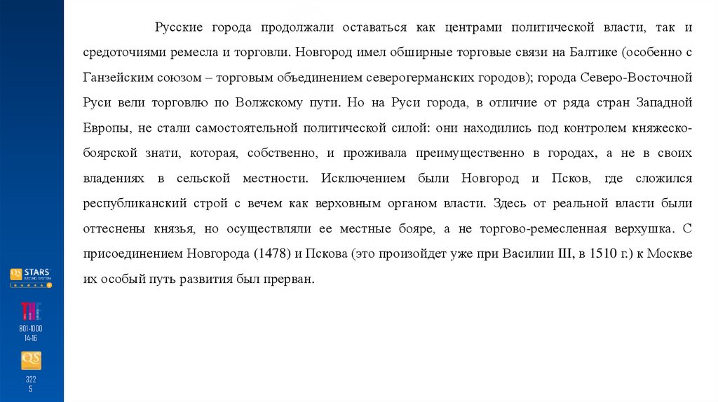 Европы, не стали самостоятельной политической силой: они находились под контролем княжескобоярской знати, которая, собственно, и проживала преимущественно в городах, а не в своих