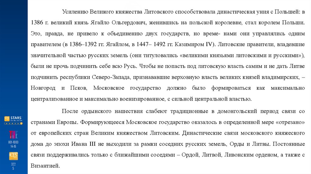 Усилению Великого княжества Литовского способствовала династическая уния с Польшей: в1386 г. великий князь Ягайло Ольгердович, женившись на польской королевне, стал королем Польши.