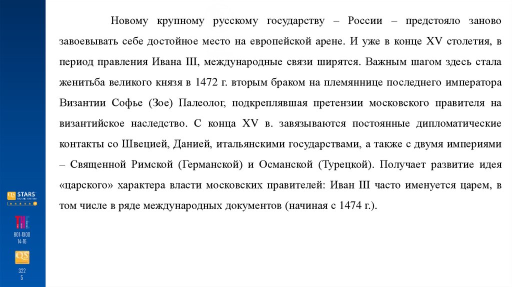 Новому крупному русскому государству – России – предстояло зановозавоевывать себе достойное место на европейской арене. И уже в конце XV столетия, в