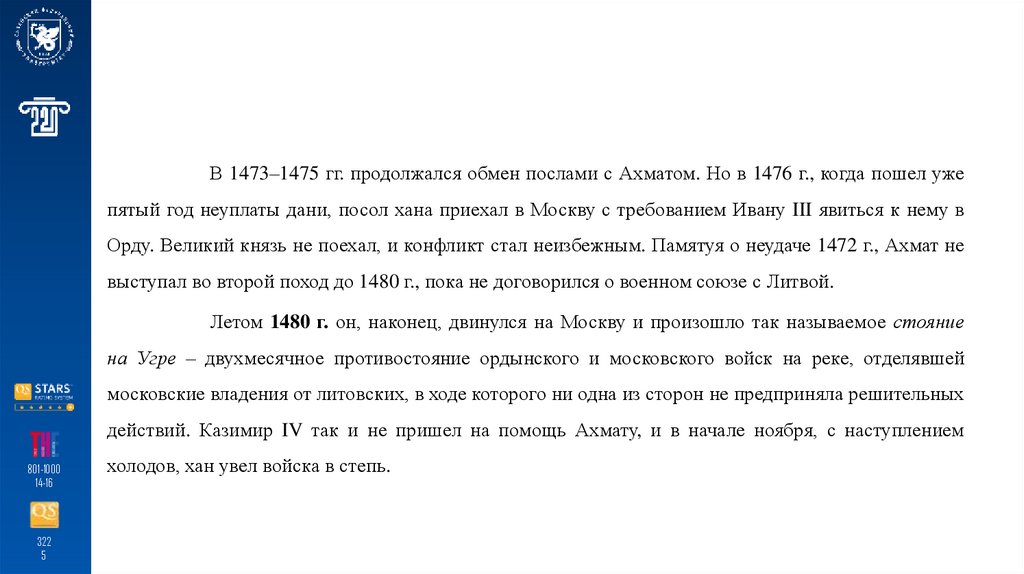 В 1473–1475 гг. продолжался обмен послами с Ахматом. Но в 1476 г., когда пошел ужепятый год неуплаты дани, посол хана приехал в Москву с требованием Ивану III явиться к нему в
