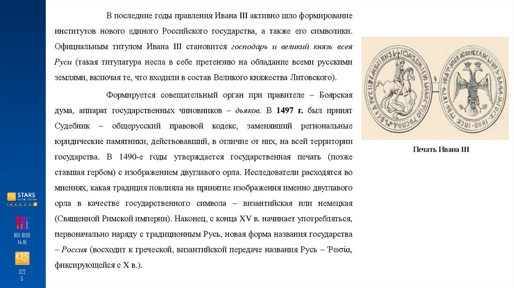 В последние годы правления Ивана III активно шло формированиеинститутов нового единого Российского государства, а также его символики.