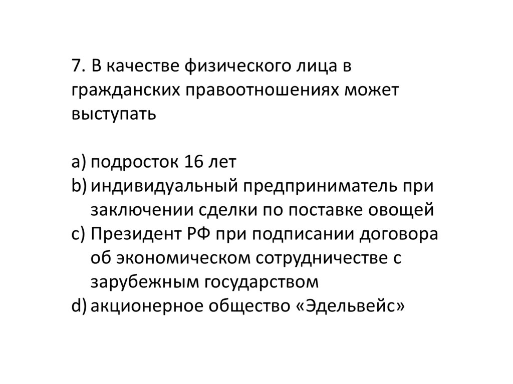• Участники гражданских правоотношений:физические и юридические лица, государство,