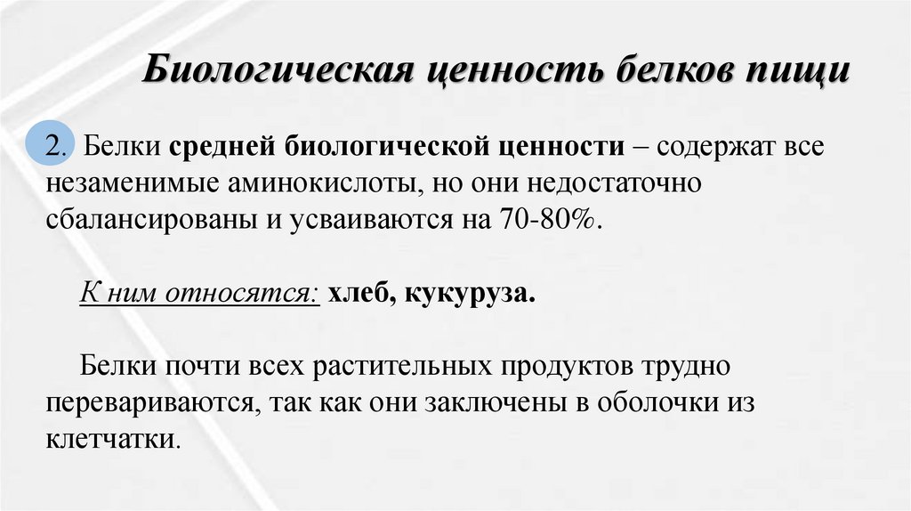 Биологическая ценность белков пищи2. Белки средней биологической ценности – содержат все