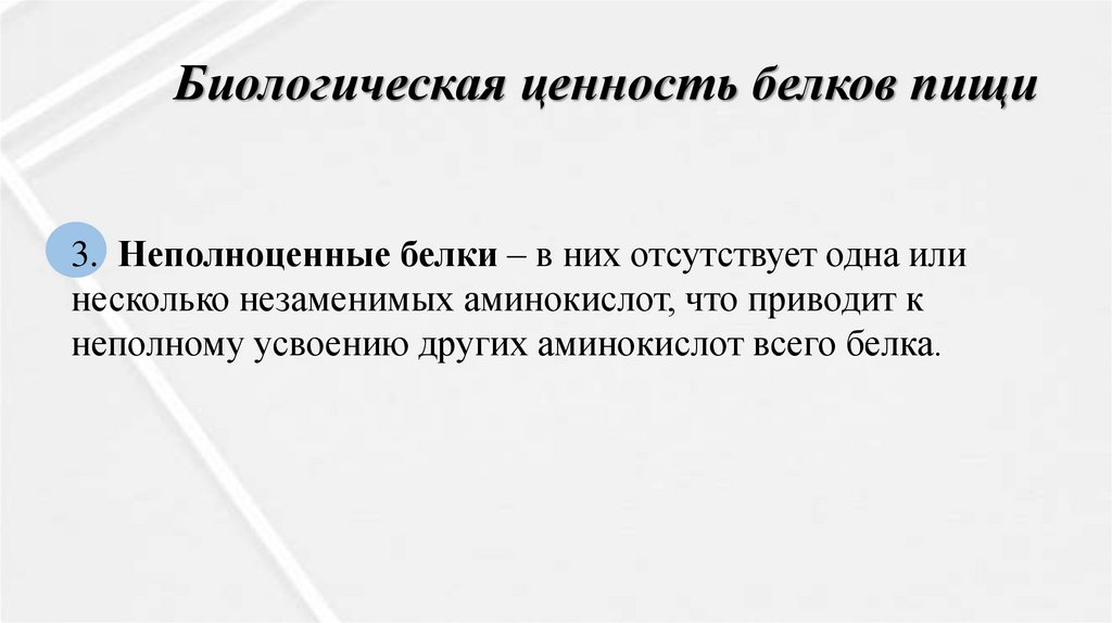 Биологическая ценность белков пищи3. Неполноценные белки – в них отсутствует одна или