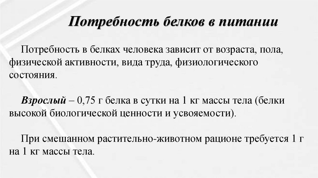Взрослый – 0,75 г белка в сутки на 1 кг массы тела (белки