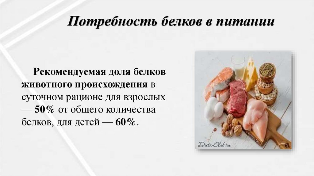 Потребность белков в питанииПотребность в белках человека зависит от возраста, пола,
