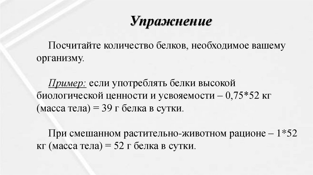УпражнениеПосчитайте количество белков, необходимое вашему