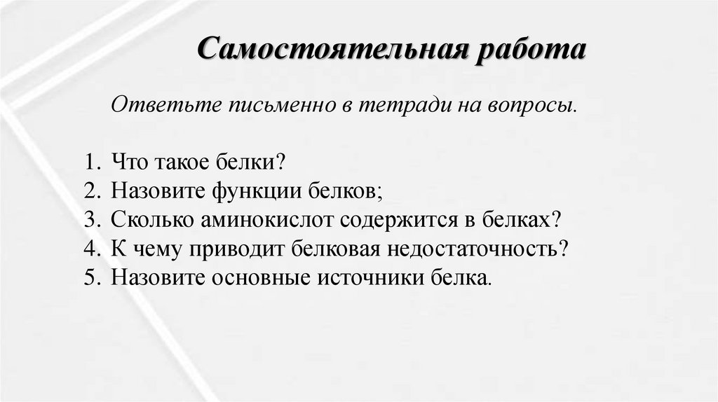 Самостоятельная работаОтветьте письменно в тетради на вопросы.