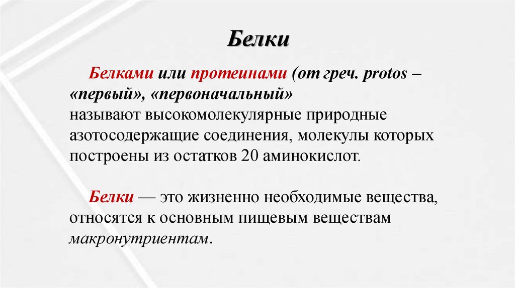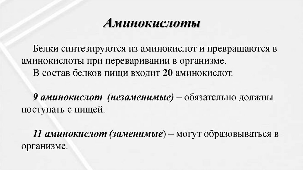 АминокислотыБелки синтезируются из аминокислот и превращаются в