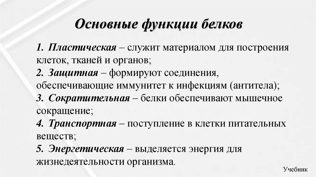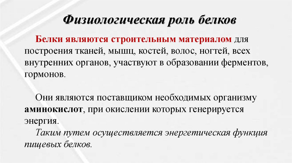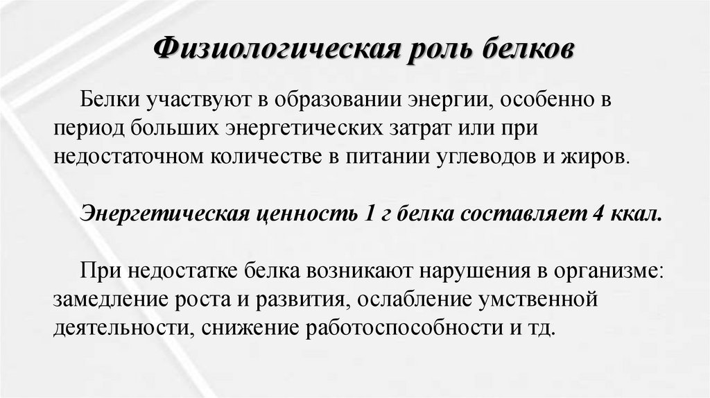 Физиологическая роль белковБелки участвуют в образовании энергии, особенно в