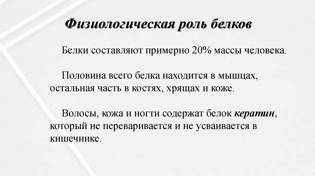 Физиологическая роль белковБелки составляют примерно 20% массы человека.