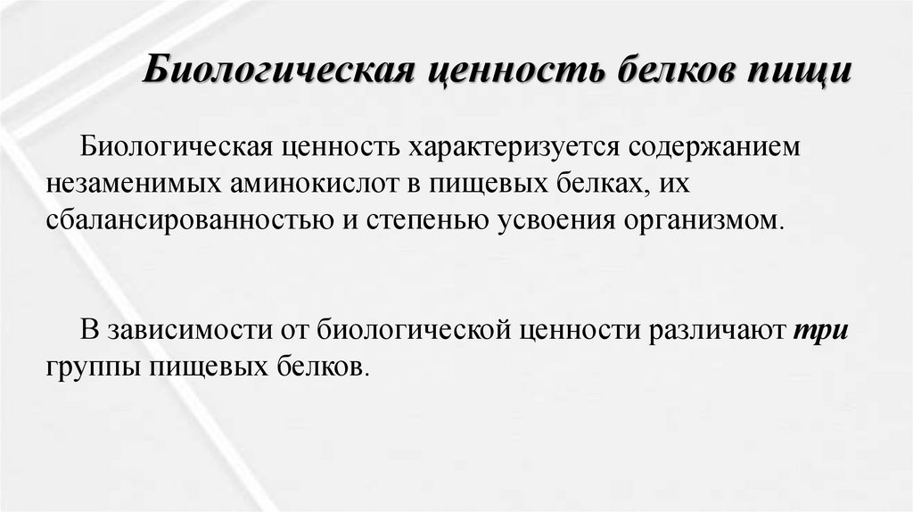Биологическая ценность белков пищиБиологическая ценность характеризуется содержанием