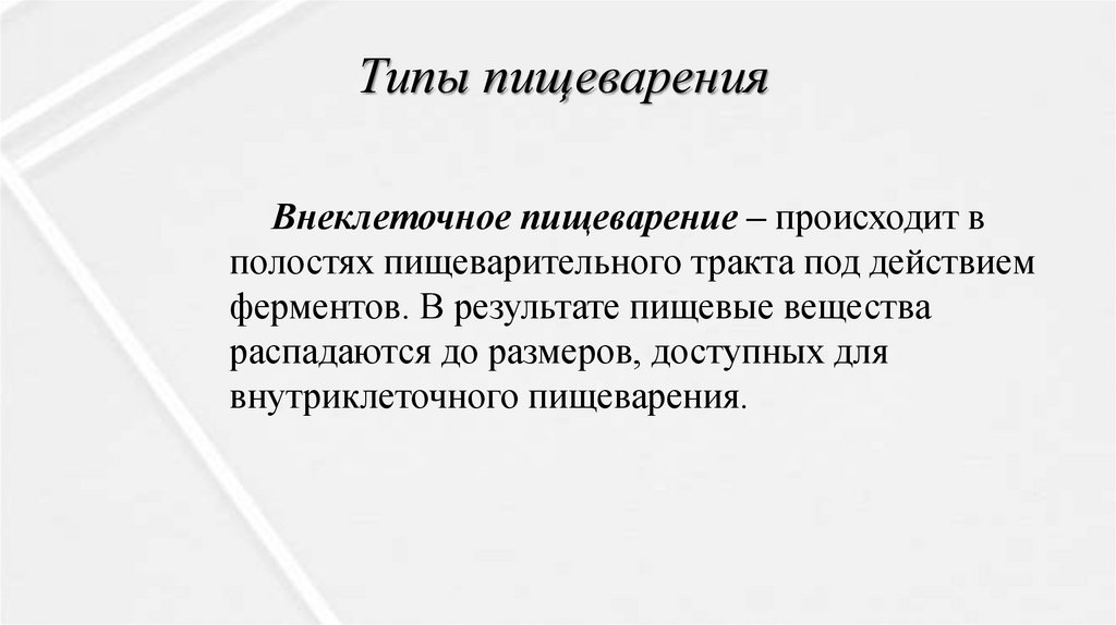 Типы пищеваренияВнеклеточное пищеварение – происходит в