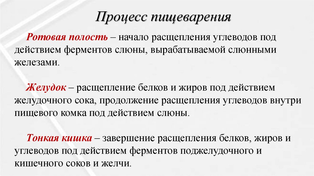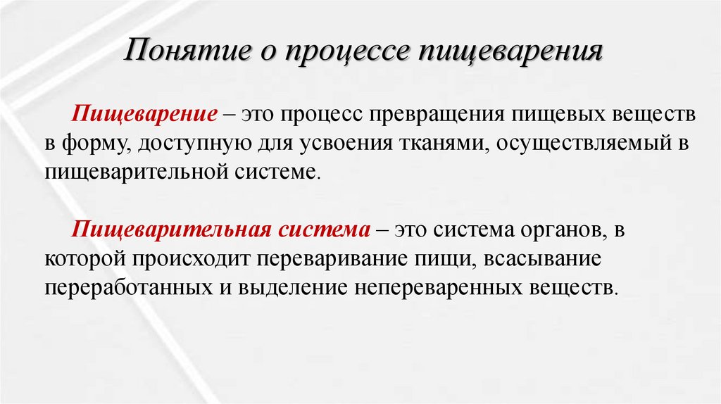 Понятие о процессе пищеваренияПищеварение – это процесс превращения пищевых веществ
