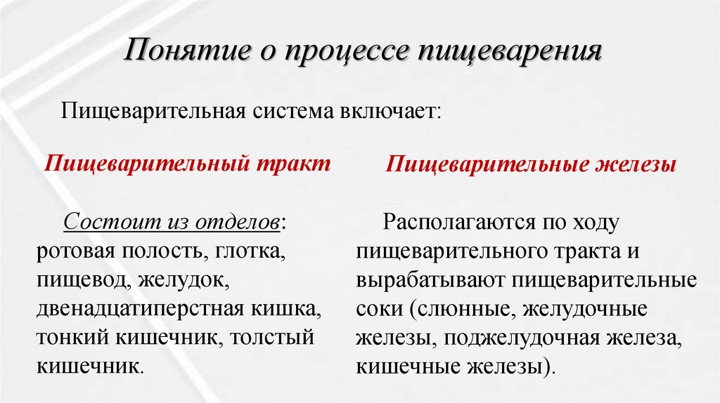 Понятие о процессе пищеваренияПищеварительная система включает: