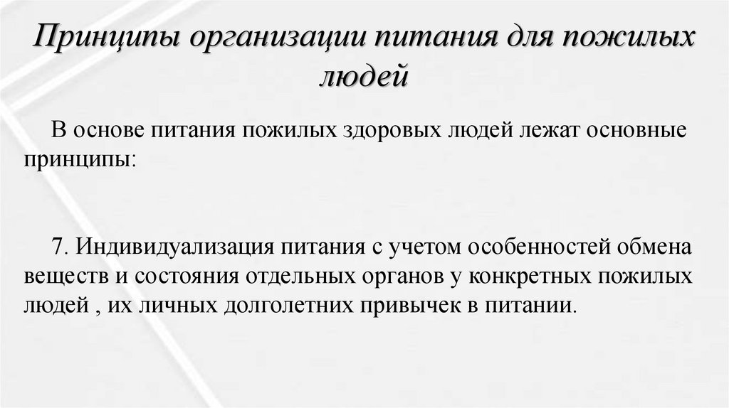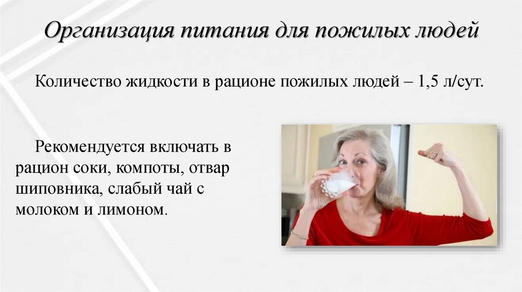 Организация питания для пожилых людейКоличество жидкости в рационе пожилых людей – 1,5 л/сут.