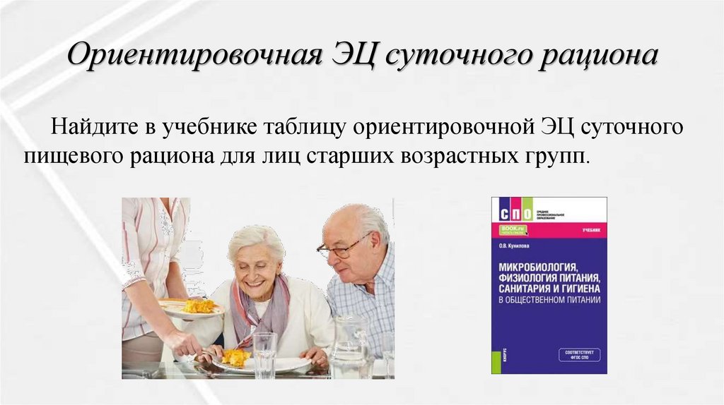 Ориентировочная ЭЦ суточного рационаНайдите в учебнике таблицу ориентировочной ЭЦ суточного