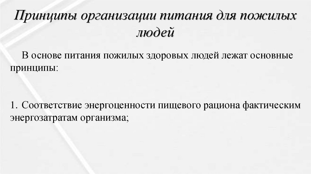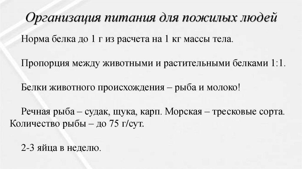 Организация питания для пожилых людейНорма белка до 1 г из расчета на 1 кг массы тела.