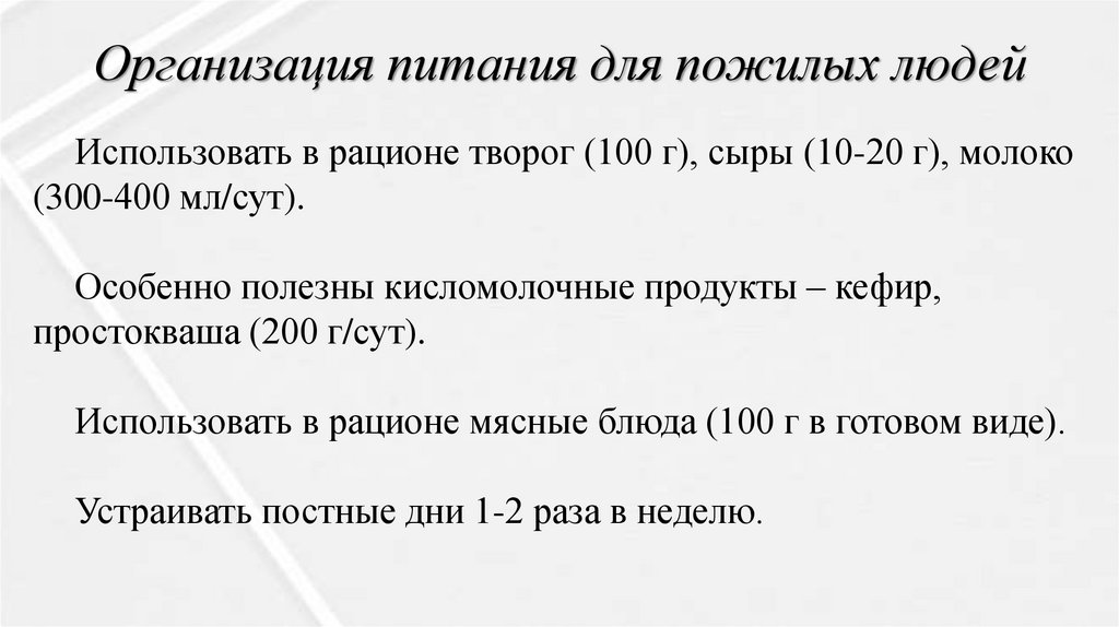 Организация питания для пожилых людейИспользовать в рационе творог (100 г), сыры (10-20 г), молоко