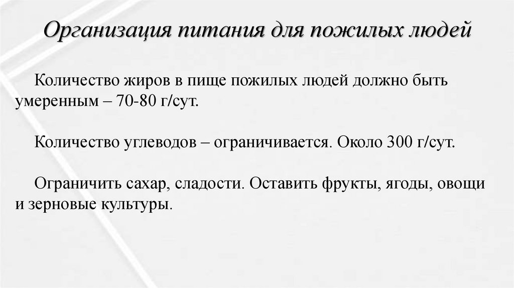 Организация питания для пожилых людейКоличество жиров в пище пожилых людей должно быть