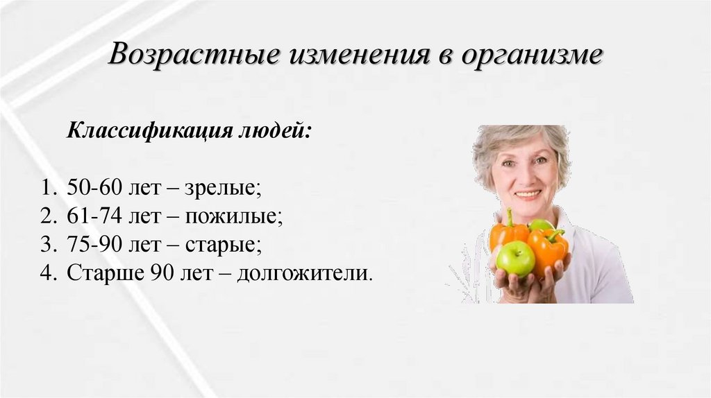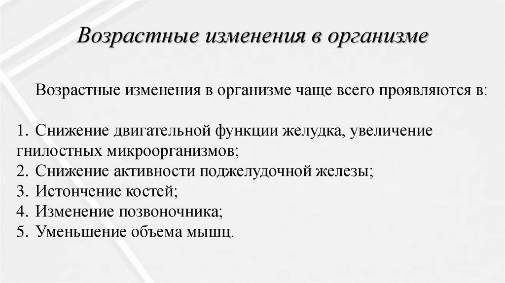 Возрастные изменения в организмеВозрастные изменения в организме чаще всего проявляются в: