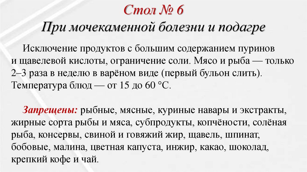 и щавелевой кислоты, ограничение соли. Мясо и рыба — только
