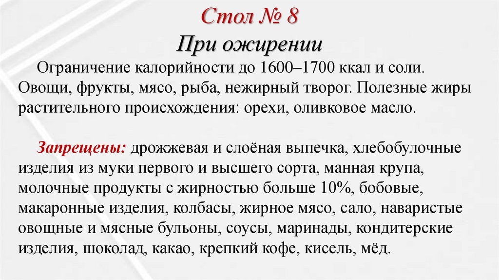 Ограничение калорийности до 1600–1700 ккал и соли.