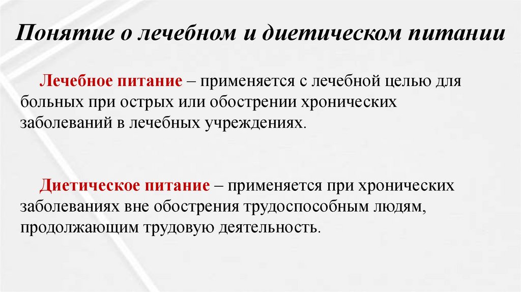 Понятие о лечебном и диетическом питанииЛечебное питание – применяется с лечебной целью для