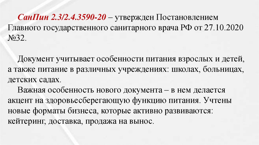 СанПин 2.3/2.4.3590-20 – утвержден ПостановлениемГлавного государственного санитарного врача РФ от 27.10.2020