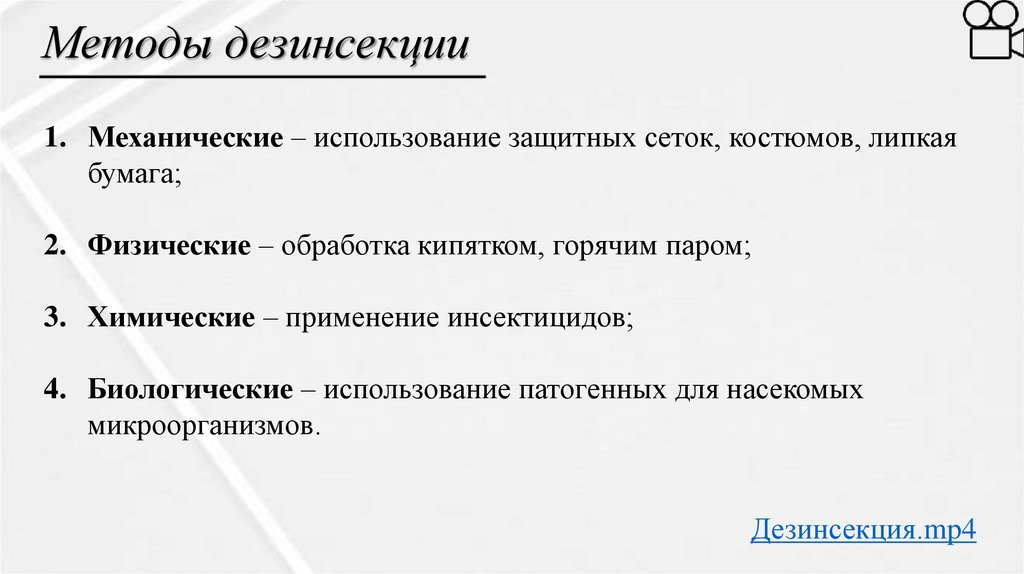 Методы дезинсекции1. Механические – использование защитных сеток, костюмов, липкая