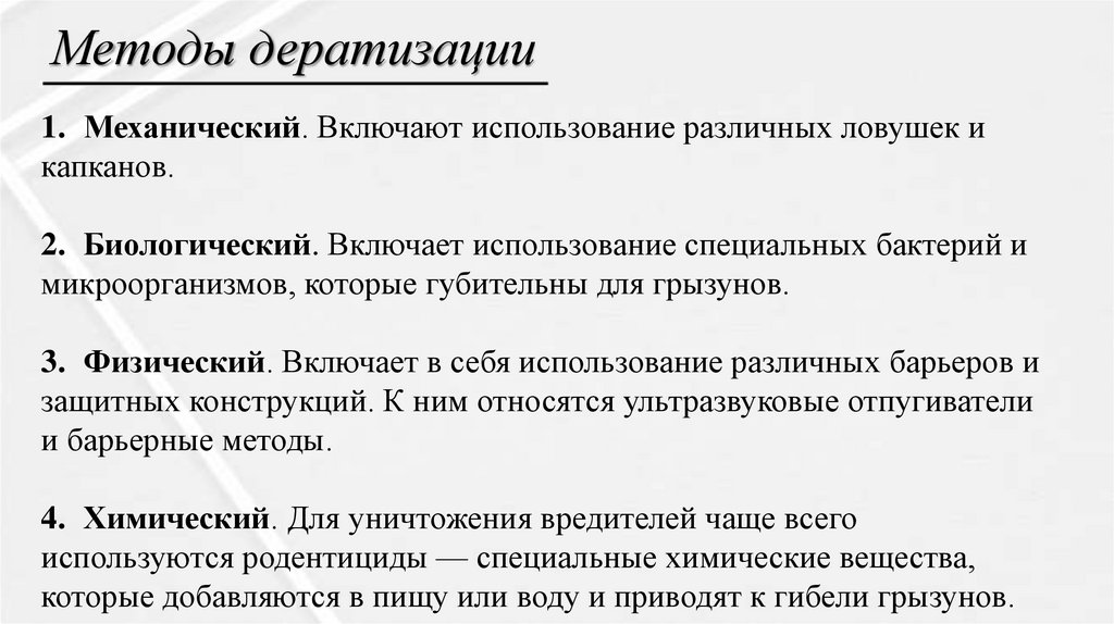 Методы дератизации1. Механический. Включают использование различных ловушек и