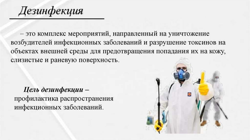 Дезинфекция– это комплекс мероприятий, направленный на уничтожение
