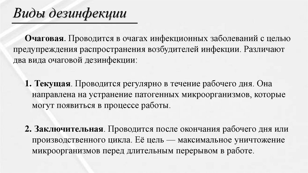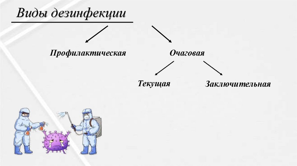 Виды дезинфекцииОчаговая. Проводится в очагах инфекционных заболеваний с целью