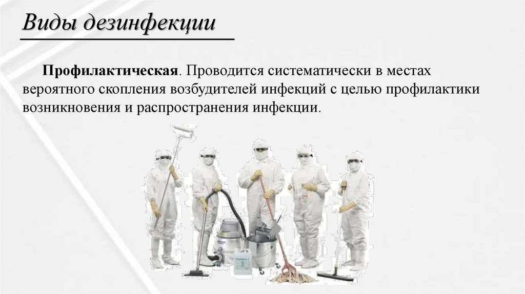 Виды дезинфекцииПрофилактическая. Проводится систематически в местах