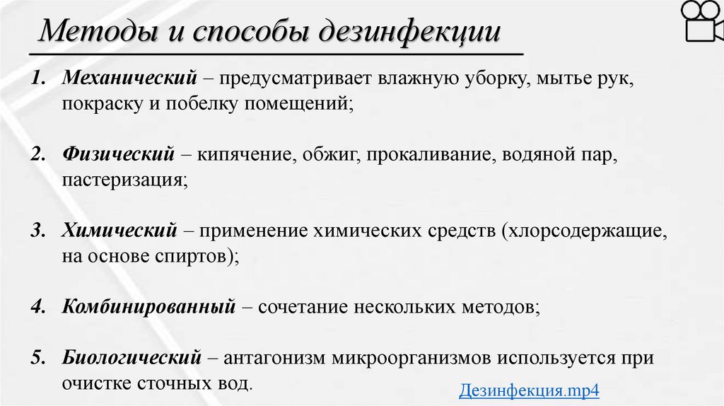 Методы и способы дезинфекции1. Механический – предусматривает влажную уборку, мытье рук,