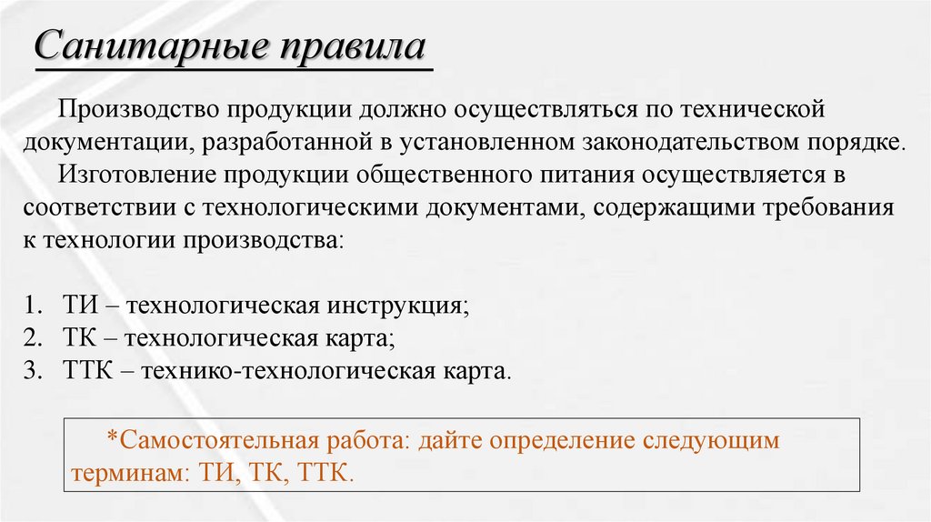 Санитарные правилаПроизводство продукции должно осуществляться по технической