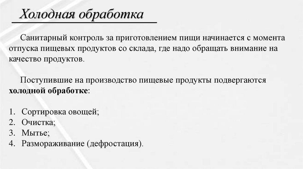 Холодная обработкаСанитарный контроль за приготовлением пищи начинается с момента