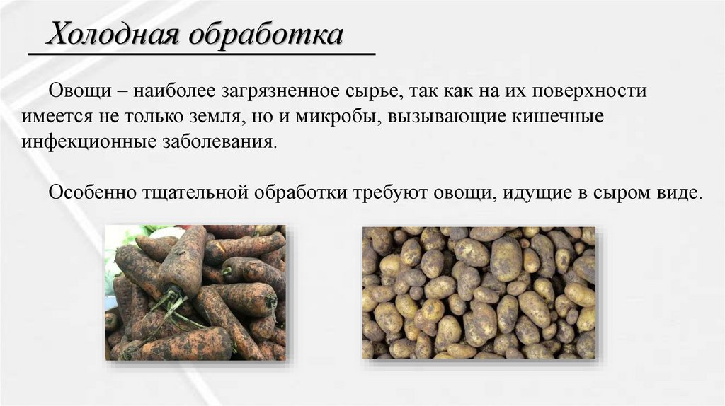 Холодная обработкаОвощи – наиболее загрязненное сырье, так как на их поверхности