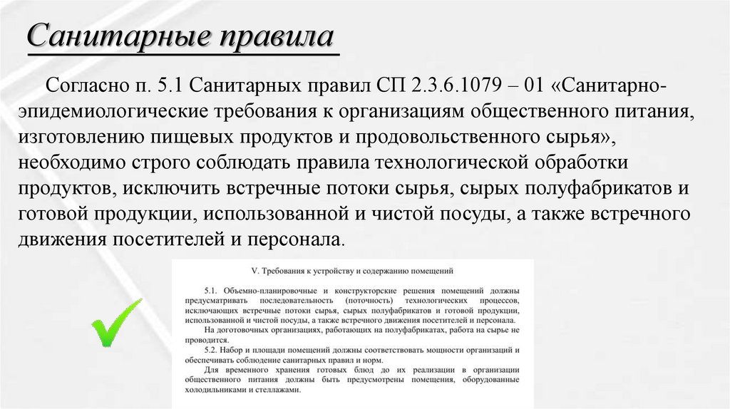 Санитарные правилаСогласно п. 5.1 Санитарных правил СП 2.3.6.1079 – 01 «Санитарноэпидемиологические требования к организациям общественного питания,