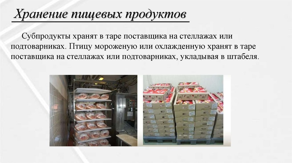Хранение пищевых продуктовСубпродукты хранят в таре поставщика на стеллажах или