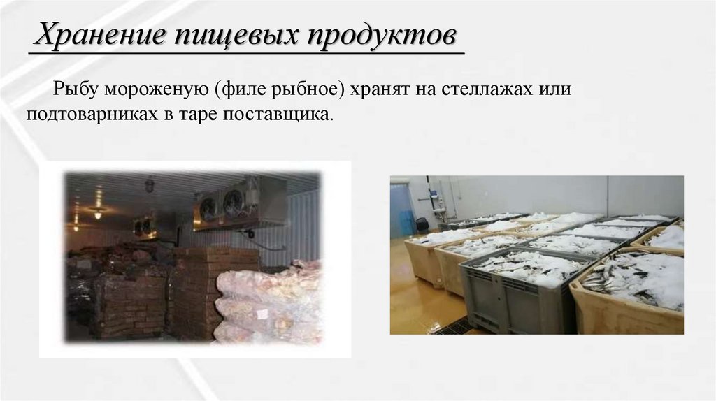 Хранение пищевых продуктовРыбу мороженую (филе рыбное) хранят на стеллажах или