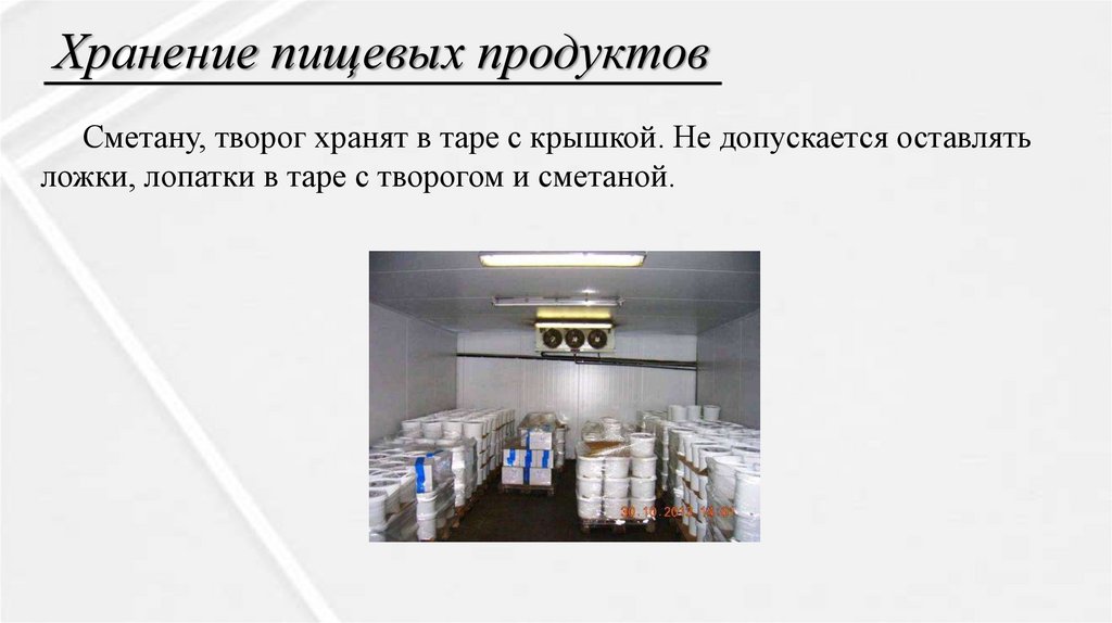 Хранение пищевых продуктовСметану, творог хранят в таре с крышкой. Не допускается оставлять