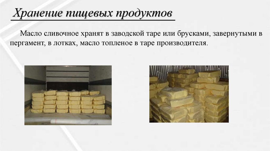 Хранение пищевых продуктовМасло сливочное хранят в заводской таре или брусками, завернутыми в